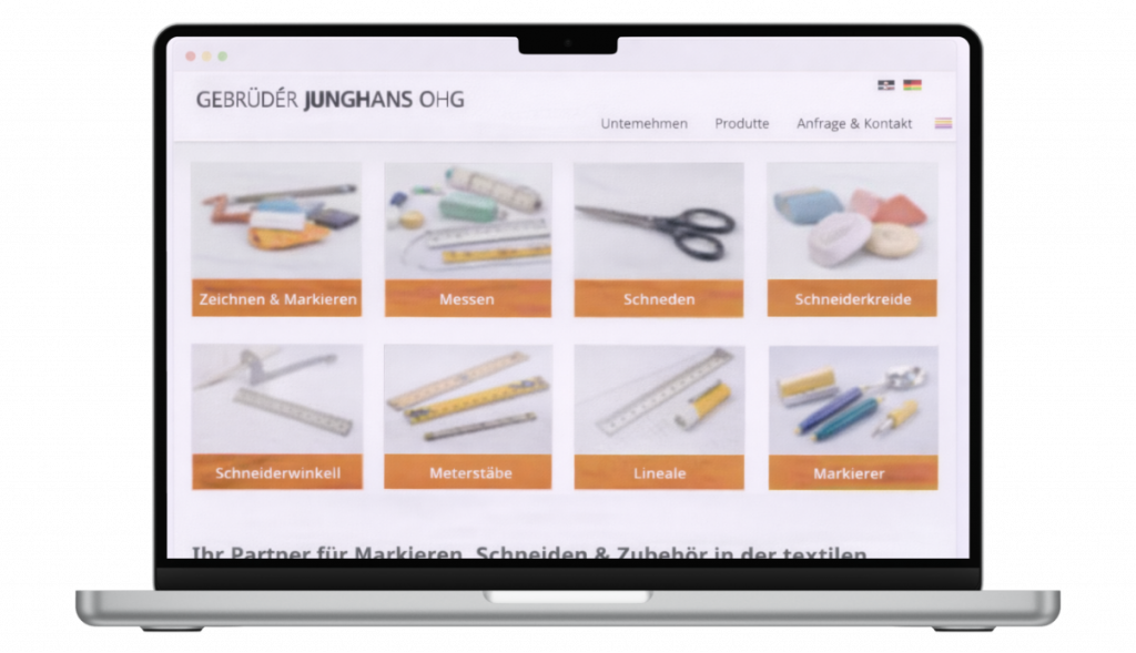 Gerade im professionellen Textilbereich ist es wichtig, dass Kunden schnell erkennen können, welche Werkzeuge sie für ihre Arbeitsprozesse benötigen – vom Markieren über das Messen bis hin zum Schneiden. Die vorhandene Website bot hierfür jedoch nur eine begrenzte Struktur und führte Besucher nicht klar zu den wichtigsten Produktbereichen.