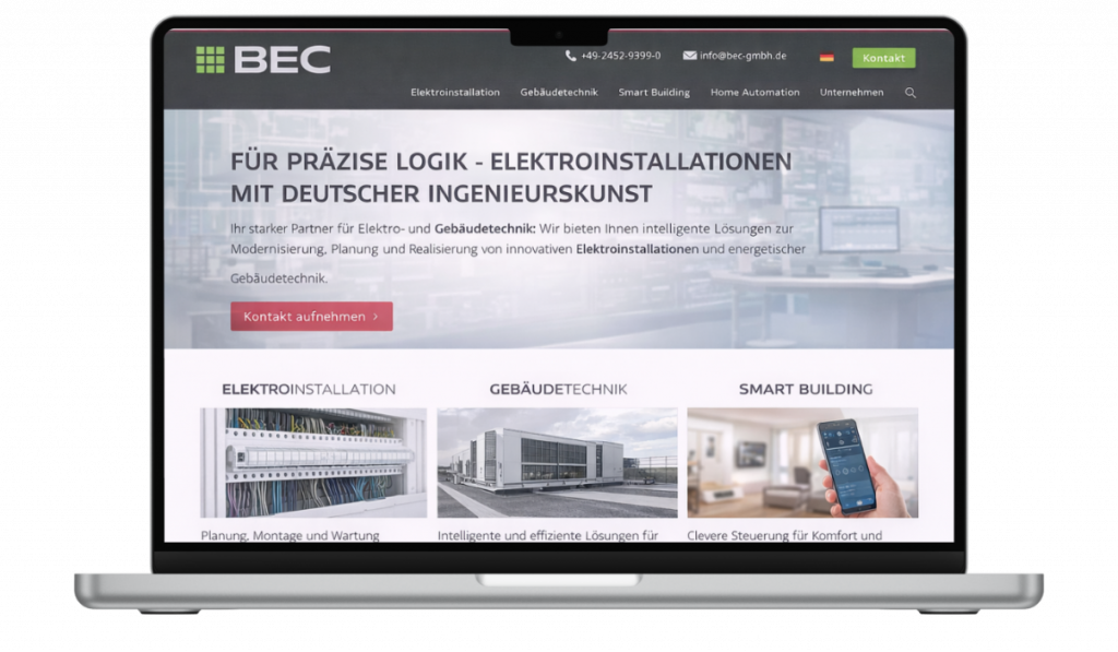Die neue Website präsentiert die Leistungen der BEC GmbH deutlich strukturierter und professioneller und stärkt die Wahrnehmung des Unternehmens als zuverlässigen Partner im Bereich Elektro- und Gebäudetechnik.
